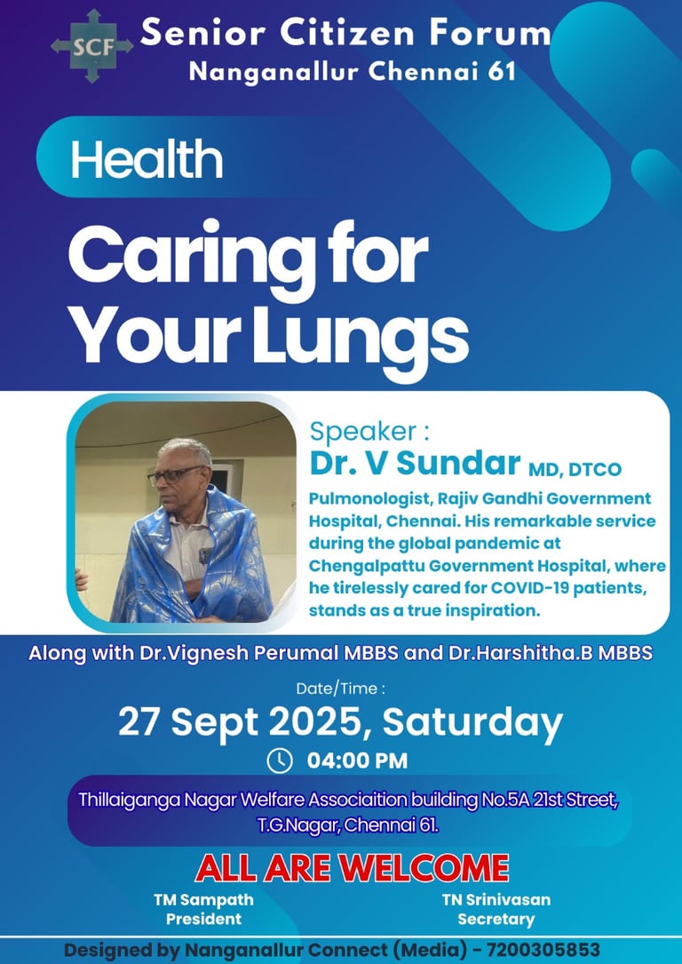 The Senior Citizen Forum, Nanganallur Chennai 61, is bringing an important health initiative for the community with an exclusive session titled “Caring for Your Lungs.” This informative talk will be held on Saturday, 27 September 2025 at 4.00 PM at Thillaiganga Nagar Welfare Association building, No.5A, 21st Street, T.G. Nagar, Chennai 61.