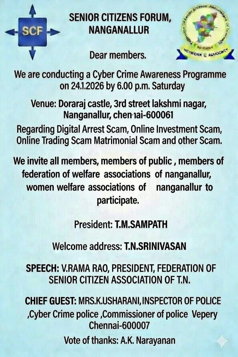 The Senior Citizens Forum, Nanganallur, is organising a Cyber Crime Awareness Programme on Saturday, 24 January 2026, at 6.00 PM. The programme will be held at Doraraj Castle, 3rd Street, Lakshmi Nagar, Nanganallur. (Official Invite attached below)