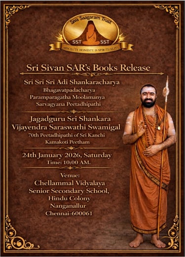 The occasion is the release of books authored by Sri Sivan SAR, organised by Siva Saagaram Trust as a part of Samvatsaram, and will be held on Saturday, January 24, 2026, at Chellammal Vidyalaya Senior Secondary School, Hindu Colony, Nanganallur. Devotees can have dharshan of Jagadguru Sri Shankaracharya Shastri Swamigal from 7:30 AM to 9:30 AM, after which the book release event will be held from 10:00 AM onwards. The event gains special significance as it is being hosted at Chellammal Vidyalaya, under the Chellammal Education Society, which has long been known for its contribution to value-based education in the region. Mr. T. R. Chandrasekaran, who heads the institution, is recognised for his efforts of hosting many important academic and cultural events. The official invite is given below, Click and swipe to view it in full screen.
