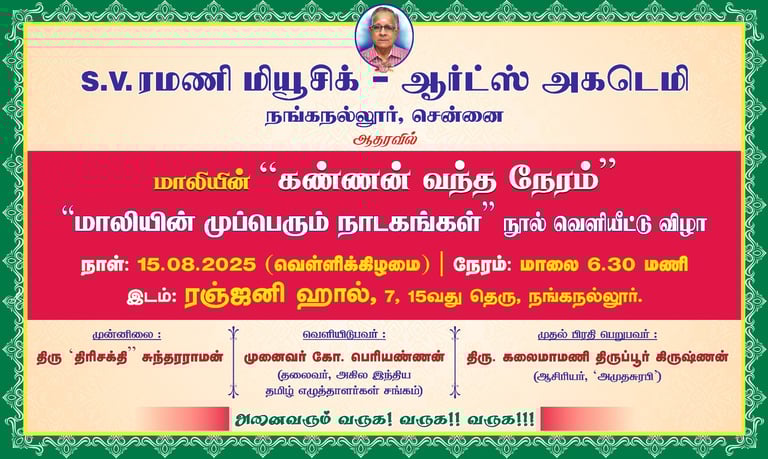 Organisers have invited literature lovers, drama enthusiasts, and the general public to witness the blend of Tamil theatre and literary heritage on Independence Day evening. The official invite is attached below. (Click and swipe for a better experience)
