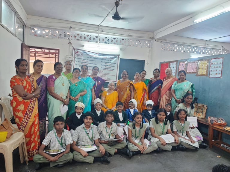The programme was organised by NLA members Dr. Subha Ravisankar, Mrs. Kanchana Raman, and Mrs. Bhanumathi Raghavan. Senior members Mrs. Saroj Ramani, Mrs. Dhanalakshmi Narasimhan, Mrs. Prema Sundararajan, Mrs. Lavanya Ramesh, Mrs. Chamundeeswari, Mrs. Parimala, Mrs. Jayanthi Satheesh, and Mrs. Sumathi took part and distributed prizes to the children.