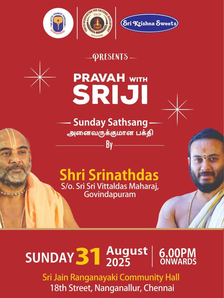 Nanganallur will resonate with devotion this evening as Pravah with Sriji presents a special Sunday Satsang featuring Shri Srinathdas, son of Sri Sri Vittaldas Maharaj of Govindapuram.