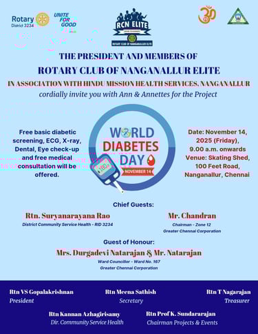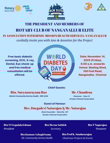 As part of World Diabetes Day, the Rotary Club of Nanganallur Elite, in association with Hindu Mission Health Services, Nanganallur, will be organizing a free health camp on November 14 (Friday) at the Skating Rink, 100 Feet Road, Nanganallur, starting from 9am onwards.