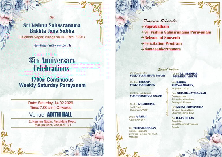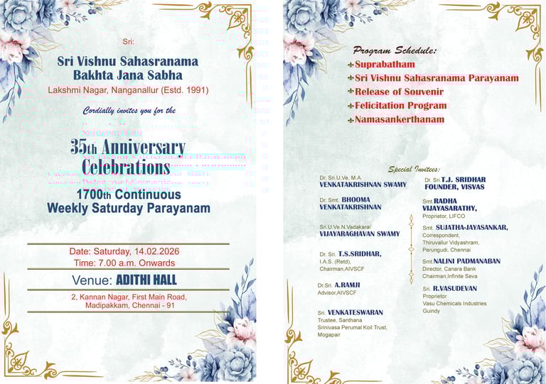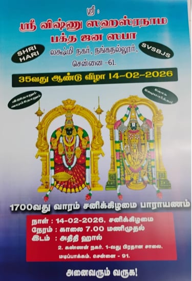 The Sri Vishnu Sahasranama Bhakta Jana Sabha, Lakshmi Nagar, Nanganallur, will commemorate its 35th Anniversary with the 1700th Continuous Weekly Saturday Parayanam, a significant spiritual milestone for the Sabha and its devotees.
