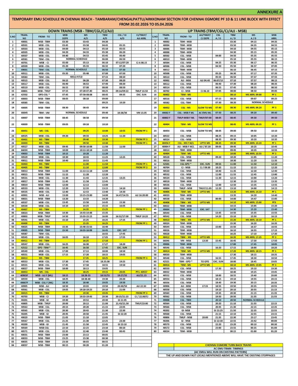 Commuters from Nanganallur, Pazhavanthangal, and surrounding areas who frequently use Egmore-bound suburban services are advised to carefully check the revised schedule before planning their travel, as platform changes and timing adjustments may impact daily commuting patterns.