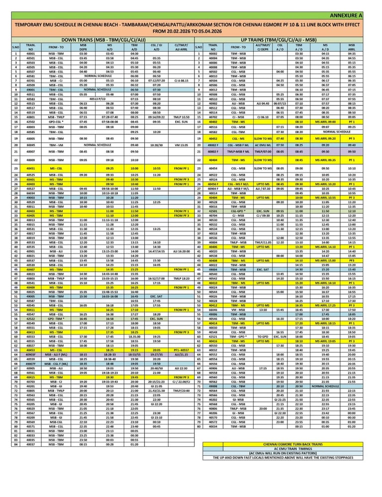 Suburban train operations at Chennai will undergo temporary changes following redevelopment works being carried out at Chennai Egmore station, as per an official press release issued by the railway authorities. The revised arrangements will be in force from February 20 to April 5, 2026, covering a period of 45 days.